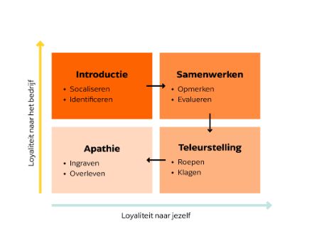 Lange dagen, nieuwe rituelen, investeren van privétijd om zich in te lezen en eigen te worden met het bedrijf. In deze fase is de loyaliteit naar het bedrijf hoog en de loyaliteit naar henzelf ondergeschikt.