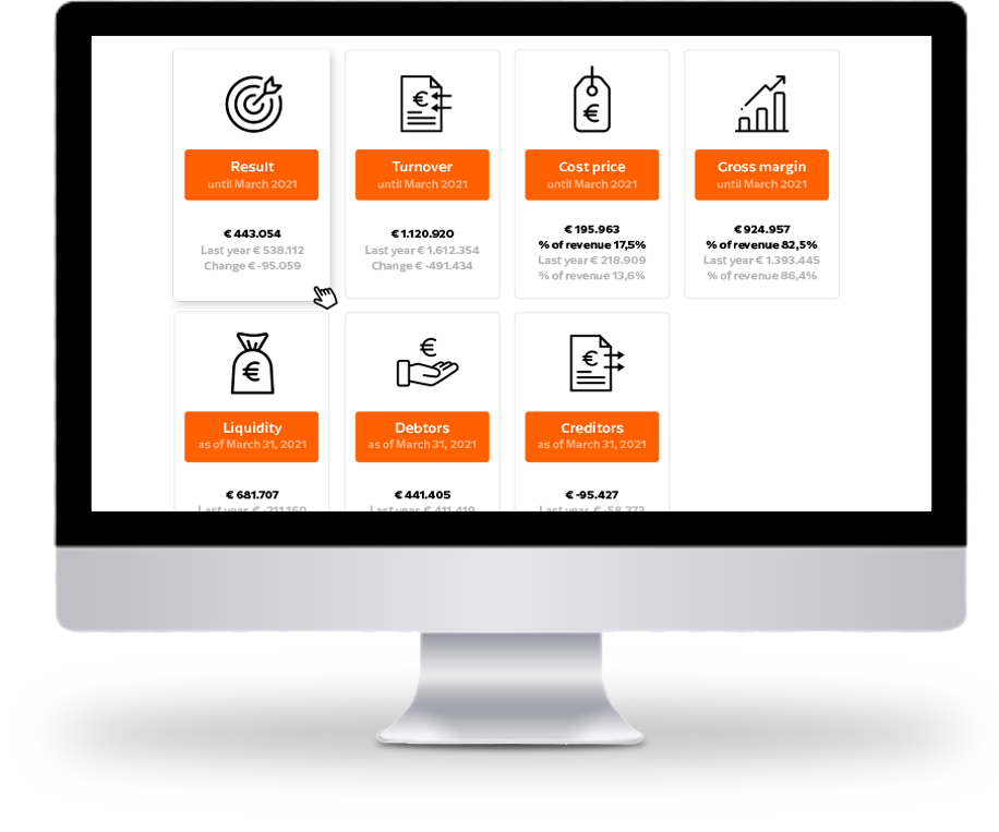 Alle drie de dashboards zijn te koppelen aan diverse boekhoudsoftware, zoals Exact Online, Visma.net, AFAS Online en nog vele andere. Met de dashboards heb je onder meer actueel inzicht in (mutaties in) het resultaat, de omzet, kostprijs, brutomarge, liquiditeit, debiteuren en crediteuren. En het geeft je de mogelijkheid tussentijdse cijfers te vergelijken met voorgaande periodes.