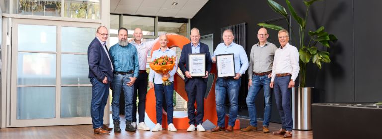 Op de foto het IBMF- team van de Jong & Laan: Dennis van der Wal (CISO), Jaap Witteveen (COO), Steven Akse (privacy officer), Dennis Krukkert (Manager IT), Wilko Faassen (Systeembeheerder), Mattijs Buitinga (vestigingsmanager) en Ruben Bremer (teammanager facilitaire zaken) en Dinant Pas, auditor van DigiTrust. Cees van der Wens, onze eigen interne auditor kon helaas niet bij de uitreiking aanwezig zijn.